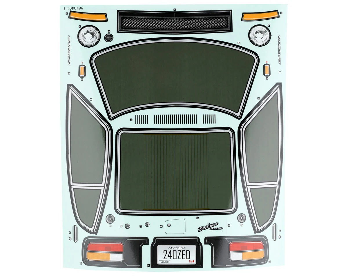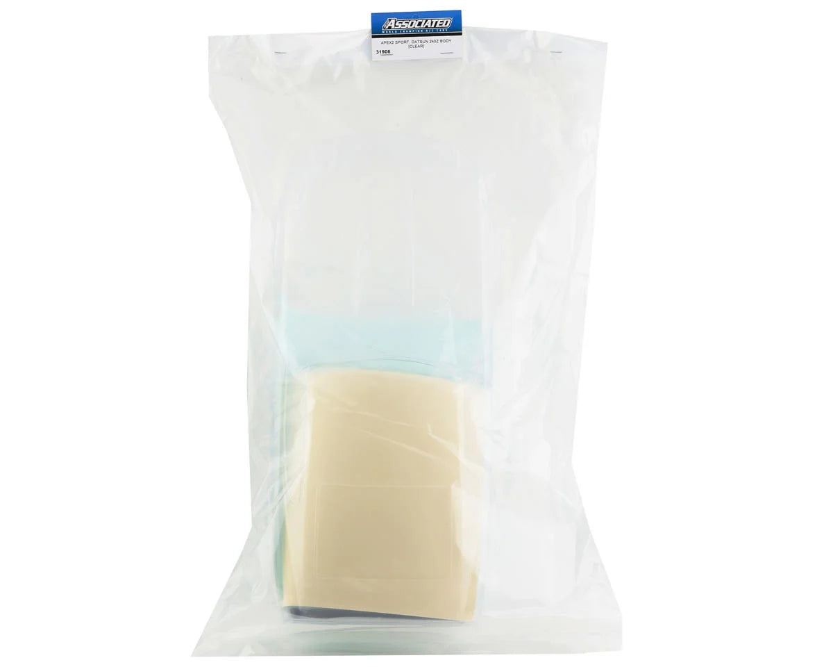 Team Associated Apex2 Sport Datsun 240Z Clear Body. This is a replacement intended for the Team Associated Apex2. Package includes one clear Datsun 240Z body, two decal sheets, plastic body accessories and window masks.