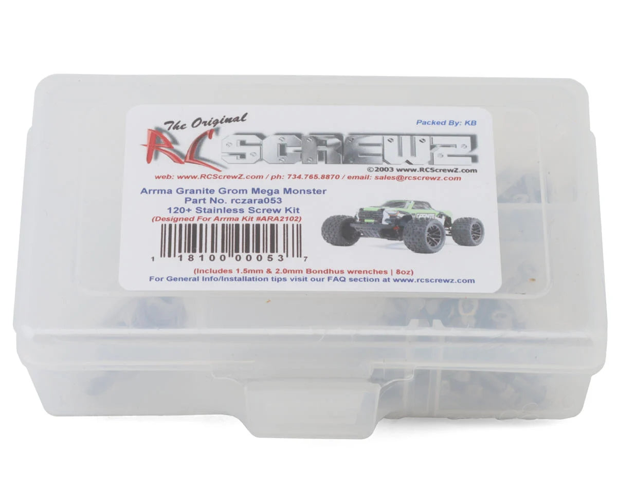 This is an optional RC Screwz Stainless Steel screw kit for the Arrma Granite Grom Mega 1/18 RTR Monster. RC Screwz Stainless Screw Kits are 100% complete. Your kit will include everything needed to do a full conversion and more. Stainless Steel Screw Kits are far superior to the screws that come stock with your RC. RCScrewz kits are made with the best stainless steel money can buy. No more bent, rusted, or corroded screws. Never worry about stripped heads again. You will not find a better screw kit for your RC at any price and RCScrewz Guarantee it.