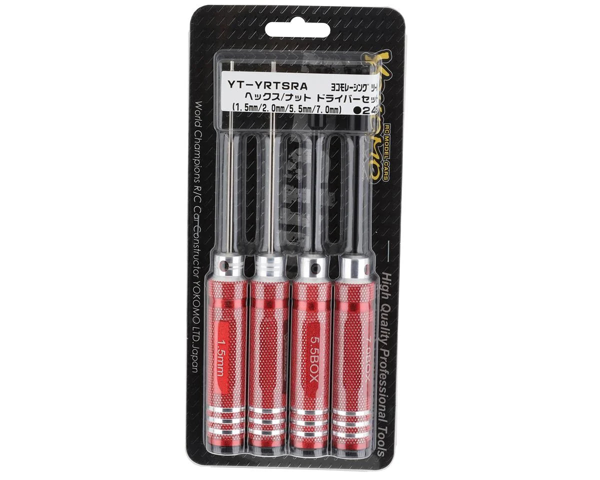 Yokomo Metric Hex and Nut Driver Set. This tool set is a great option to add an ergonomic tool set to your pit station or tool bag. The red anodized aluminum handles are marked for easy identification. These sizes are perfect for wrenching on most 1/12, 1/10 and 1/8 scale RC models. Complete your toolkit in style with this hex and nut driver set from Yokomo.